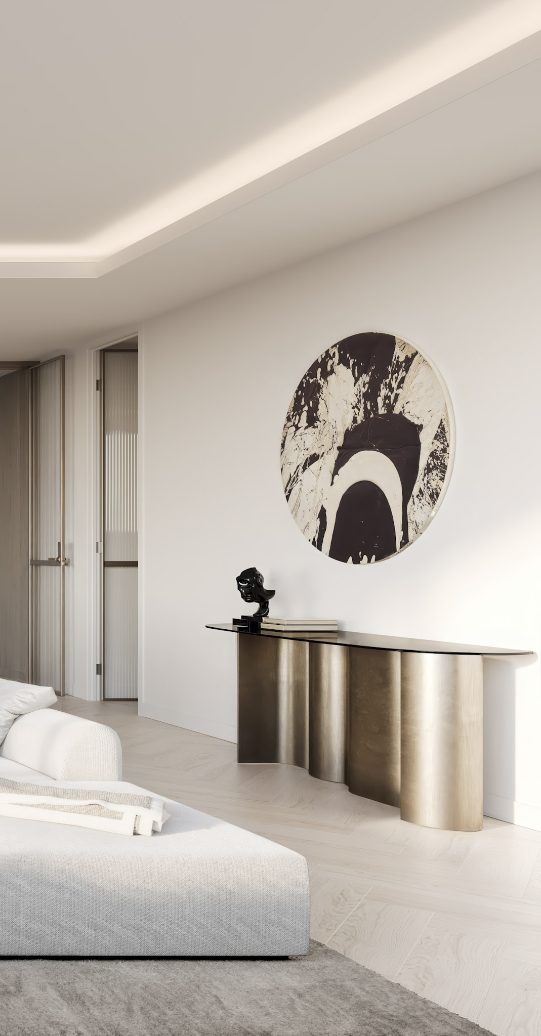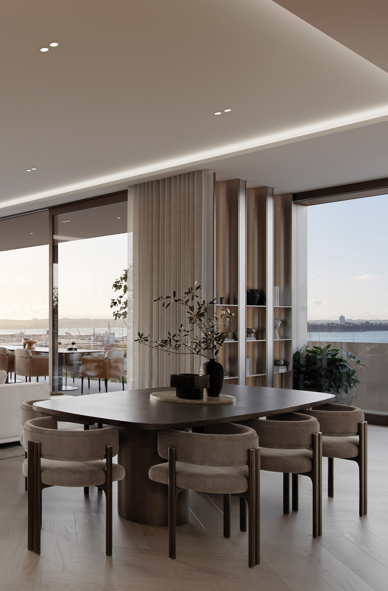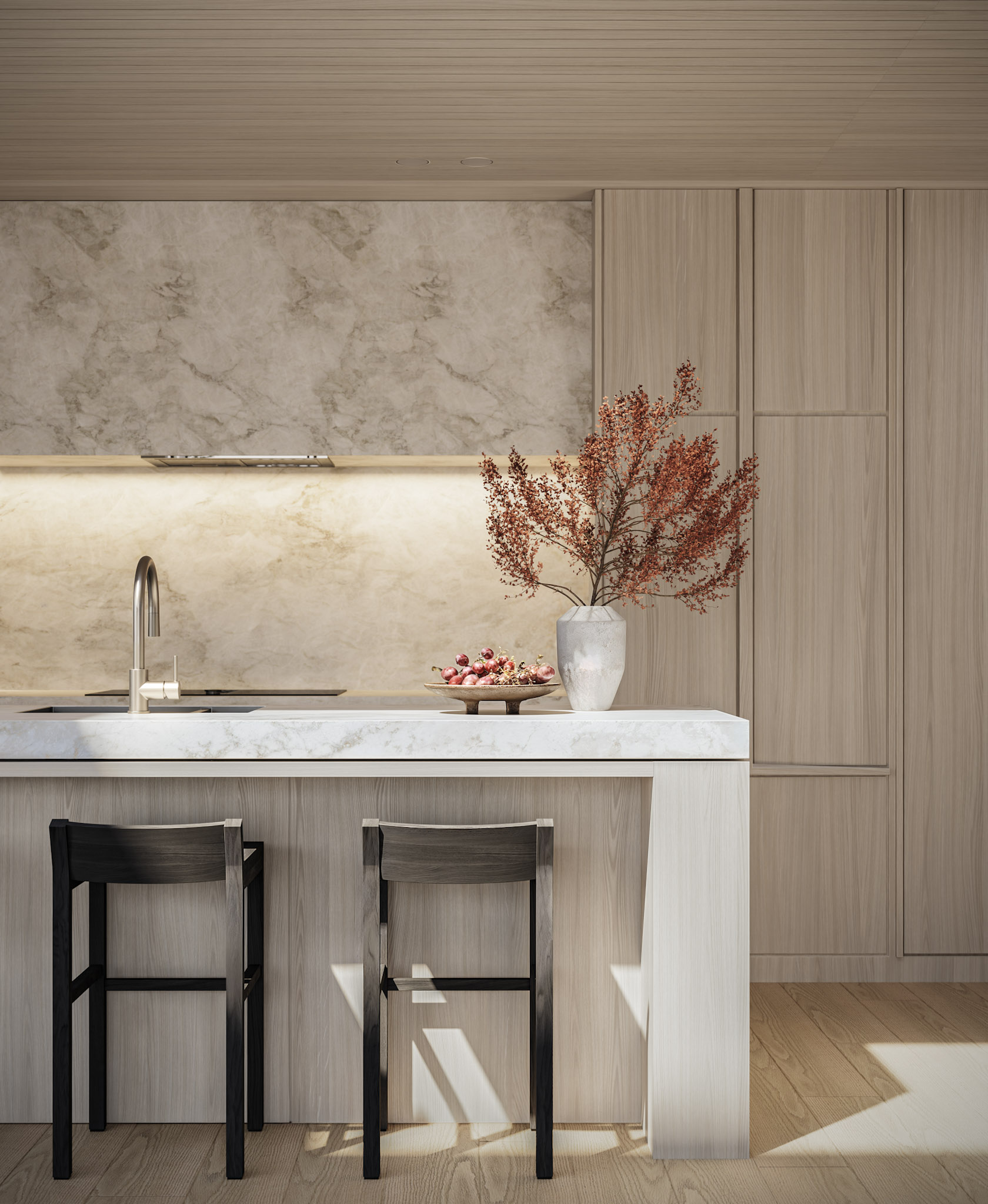 The two Penthouses in the Elysian development sets their own standard. European oak herringbone anchors the floors, its pattern lending an elegance that reads as considered rather than decorative. The Poliform kitchens arrive in a champagne finish with bronze glass cabinetry. At its centre, an oversized curved Tundra limestone island commands the space without effort. The feeling throughout is one of refinement without restraint.