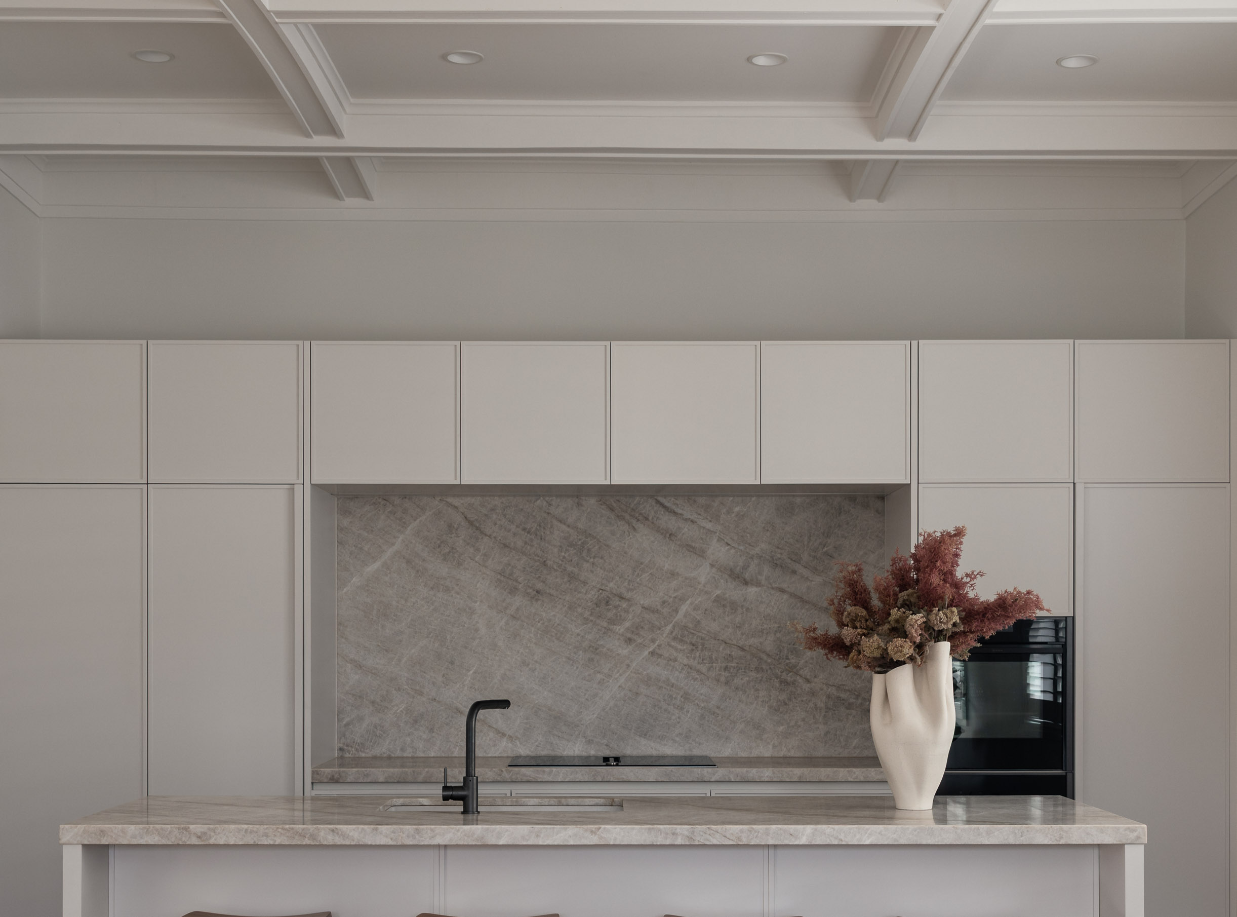 A revitalised 1940’s bungalow that prioritises practicality for a busy family. Inspired by verdant surroundings, the design incorporated oversized windows and a subtle colour palette to blend with the natural landscape. Using materials like Leathered Taj Mahal and Natural Linens, the result is a timeless family home, elegantly integrated with nature, completed in a 12-month timeframe.