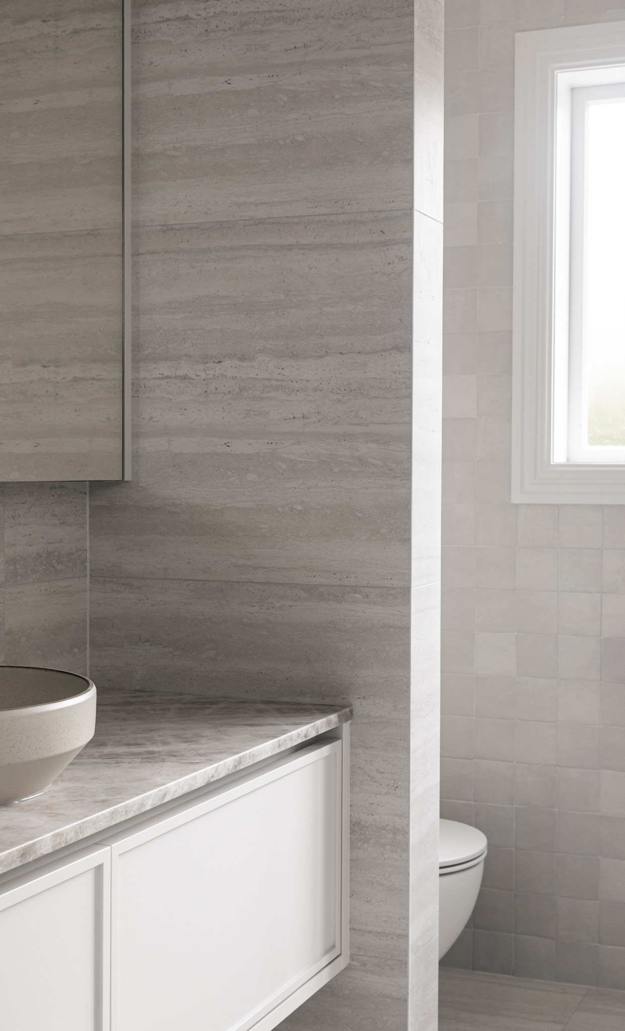 Six residences designed by Crosson Architects across three levels, The kitchen is centred on a Taj Mahal stone benchtop with a skylit scullery beyond — generous and quietly refined. Bathrooms in textured, understated tiles with brushed nickel tapware. Comfortable and elegant, without effort.