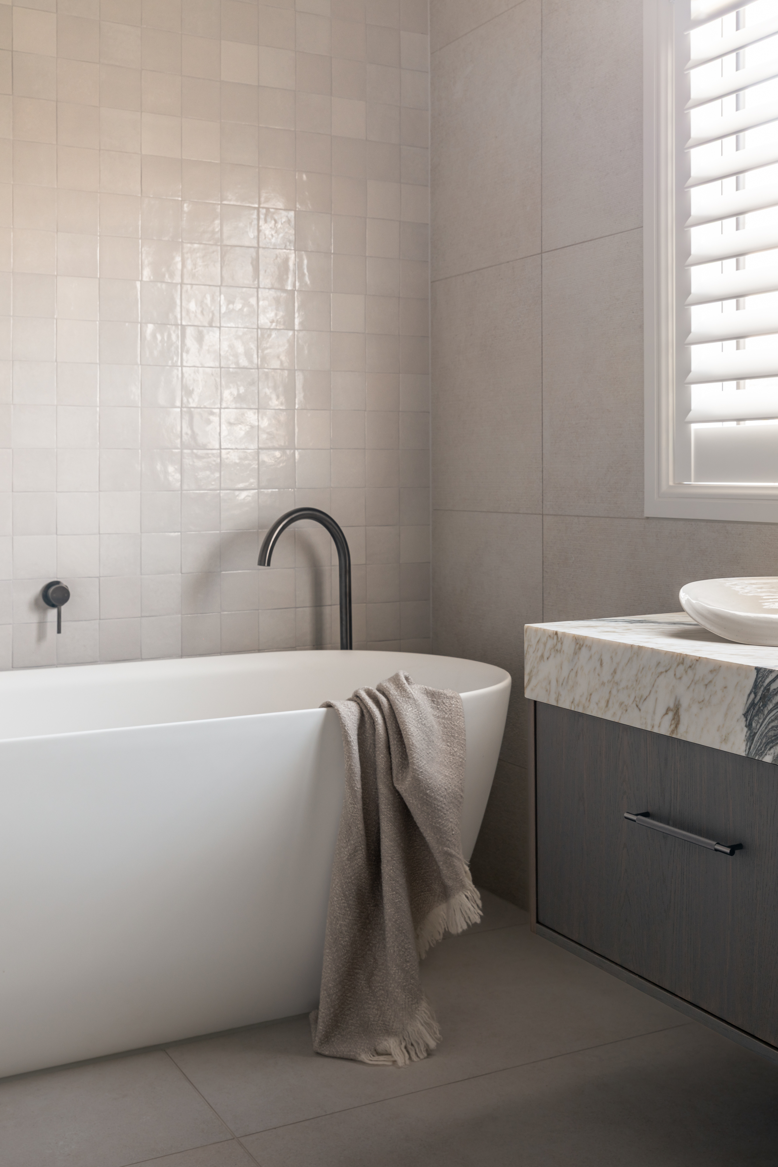 A 1920s bungalow, respected and renewed. Natural oak floors preserve the home's original ease, while putty toned slim shaker cabinetry brings the kitchen into something quieter and more deliberate. A Taj Mahal introduces subtle movement, its soft veining continuing into a bathroom combined with travertine tiles. The result is a home that feels gently evolved rather than remade.
